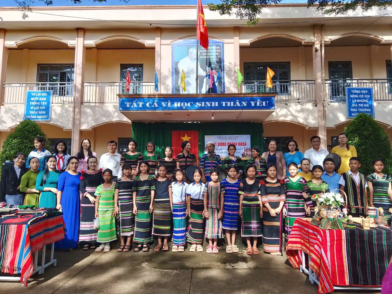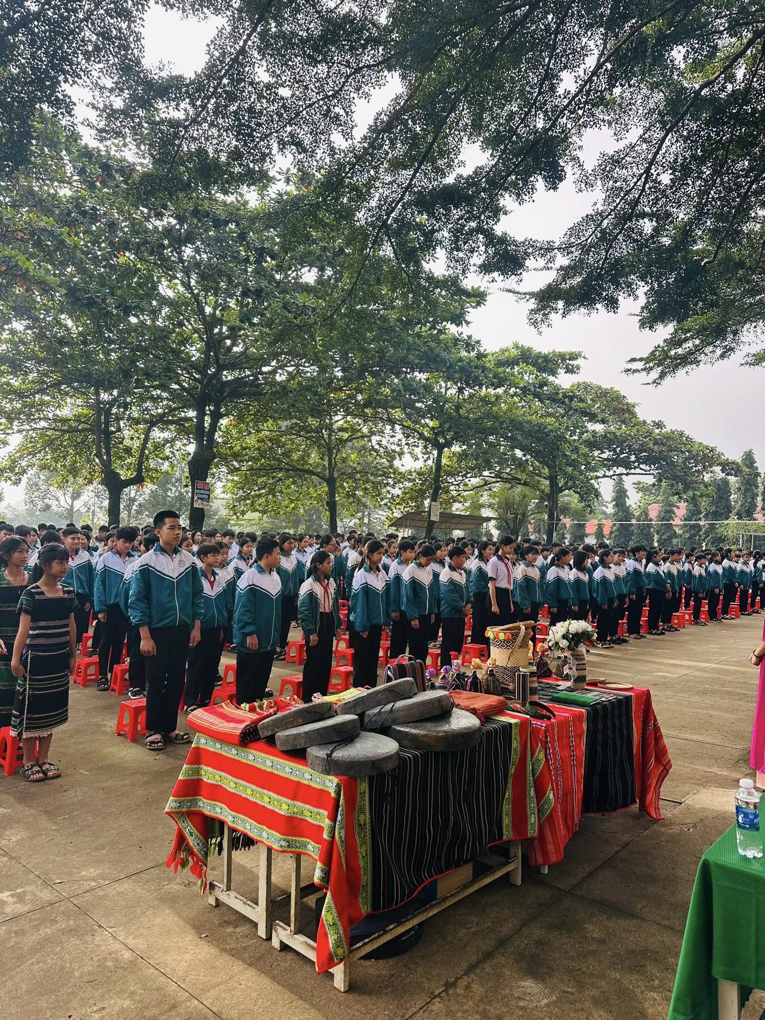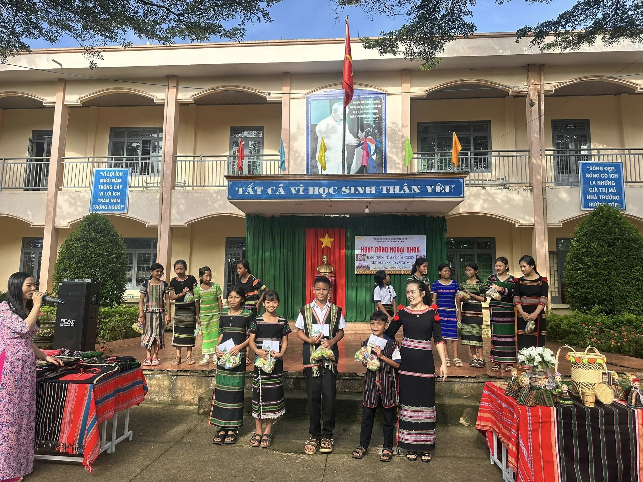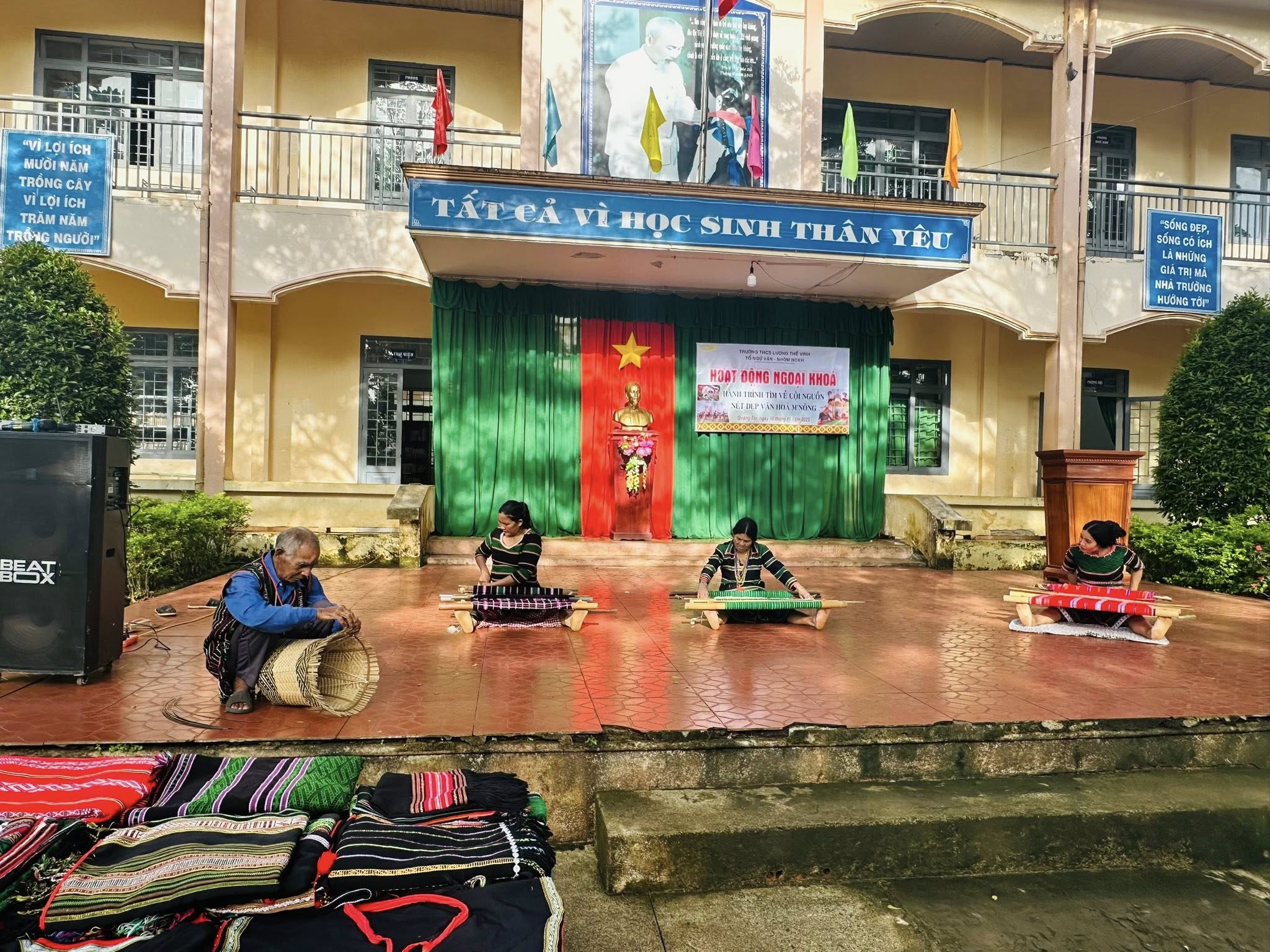 Không khí buổi ngoại khóa vô cùng sôi nổi và rộn ràng. Ngay từ sáng sớm, sân trường đã được trưng bày những sản phẩm đan lát tinh xảo, những tấm vải thổ cẩm rực rỡ và chiêng của đồng bào M’Nông. Các thầy cô và học sinh đều háo hức chờ đợi giờ phút chương trình bắt đầu.