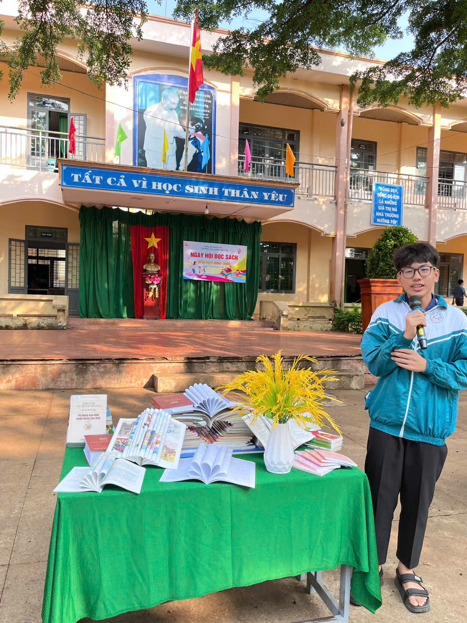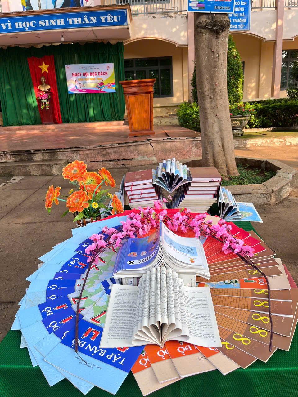 Ngay từ sáng sớm, sân trường đã được trang trí rực rỡ với nhiều gian trưng bày sách phong phú, đa dạng về thể loại như: sách văn học, lịch sử, khoa học, kỹ năng sống… Các lớp đã tích cực chuẩn bị những gian hàng sáng tạo, thể hiện sự đầu tư công phu và tinh thần yêu sách.